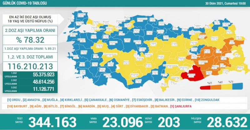 Buna göre; Türkiye'de son 24 saatte 344 bin 163 Kovid-19 testi yapıldı, 23 bin 96 kişinin testi pozitif çıktı, 203 kişi hayatını kaybetti.