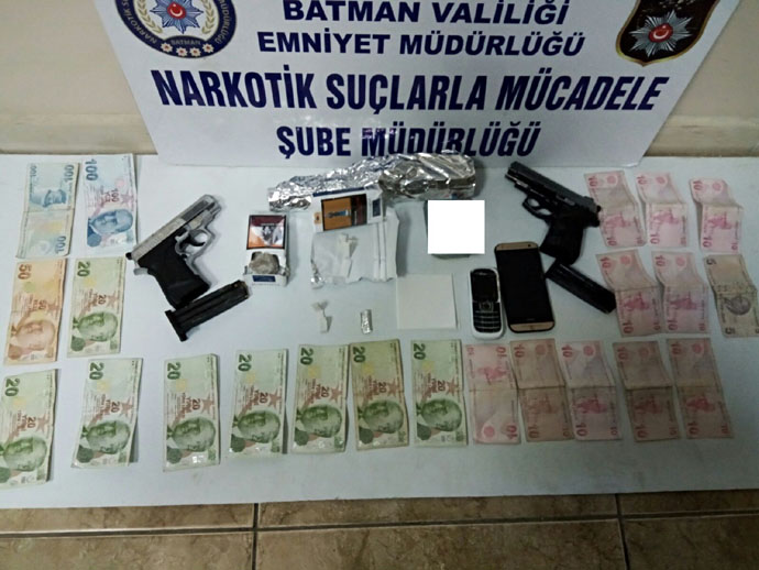 Açıklamada, "Park halinde bulunan bir aracın durumundan şüphelenilmesi üzerine görevlilerimizce yapılan aramada, aracın çeşitli bölmelerine zulalanmış vaziyette 2 adet silah ve bu silahlara ait şarjör ve fişekler ile toplam ağılığı 11 kilo 69 gram gelen eroin maddesi ve uyuşturucu madde ticaretinden elde edildiği değerlendirilen 515 TL para ele geçirilmiştir" denildi. Olayla ilgili olarak gözaltına alınan bir şüphelinin, hakkında "uyuşturucu madde ticareti yapma ve uyuşturucu sağlama" suçundan adli işlem yapıldıktan sonra adli mercilere sevk edildiği bildirildi.